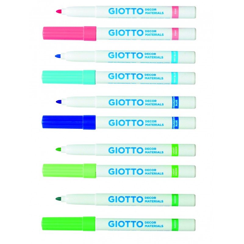 Das Giotto-Set enthält 12 Universal-Farbstifte in leuchtenden Farben. Die Fasermaler sind geeignet für alle Flächen. Sie sind mit einem feuchten Lappen von glatten Oberflächen wie Glas und Spiegel leicht abwaschbar. Die Tinten lassen sich leicht von der Haut entfernen. Können aber auf Textilien Flecken hinterlassen.