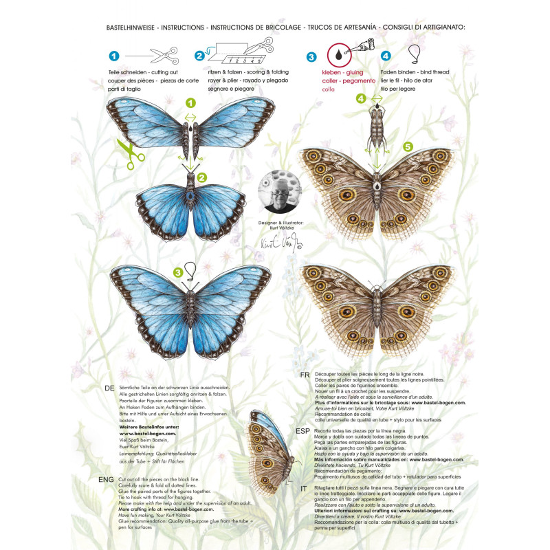 AUSSCHNEIDEN, ZUSAMMENKLEBEN UND FADEN BEFESTIGEN, DANN FLATTERN DIE SCHMETTERLINGE! Im Bastelbogen Schmetterlinge sind 7 Falter enthalten. Die 3d großen Schmetterlinge können zum Aufhängen oder zur als zauberhafte Dekoration genutzt werden.