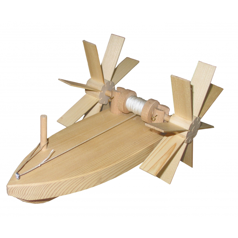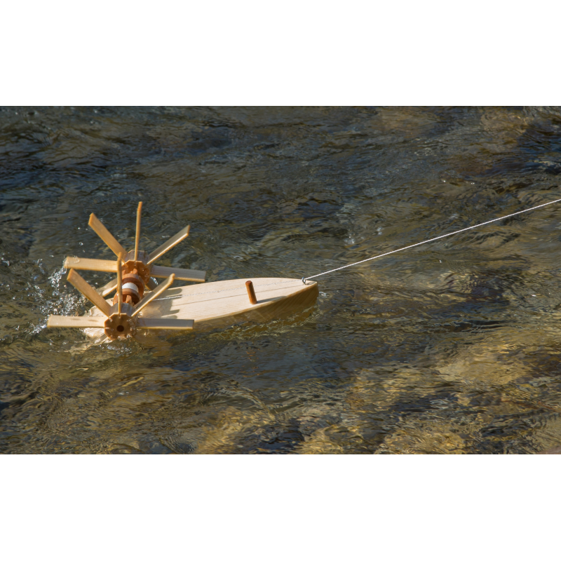 Holzbausatz für ein Schiff, das gegen die Strömung fährt. Die Schaufelräder werden von dem Wasser angetrieben. Zuerst schwimmt das Boot mit dem fließenden Wasser weg, sobald die Schnur abgewickelt ist, paddelt es gegen die Strömung zurück.