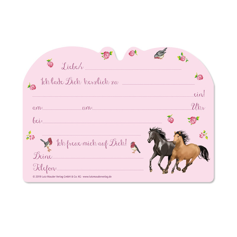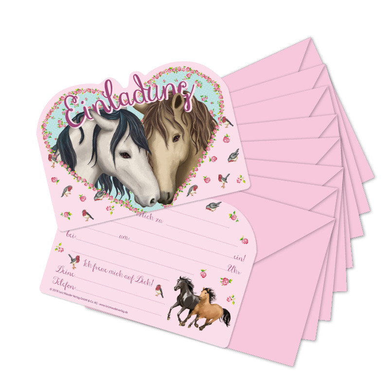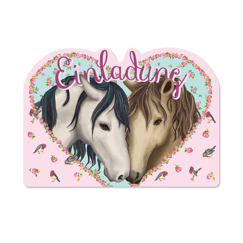 Der Kindergeburtstag mit Freunden soll gefeiert werden und die Kinder sollen eine hübsche Einladung erhalten. Die Kindergeburtstagseinladung-Glitzer Pferde 2 ist perfekt für Pferdemädchen. In diesem Set befinden sich 8 Einladungskarten mit Rückseitendruck und 8 passende farbige Umschläge mit Pferdemotiv.