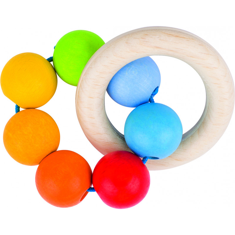 Der Holzgreifling Regenbogen ist ein farbenfrohes Holzspielzeug für Babys. Auf einer Schnur sind Kugeln in Regenbogenfarben und ein Klapperring angebracht. Bewegt das Baby den Greifling klappert der Ring.