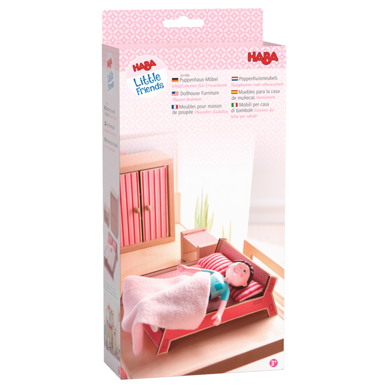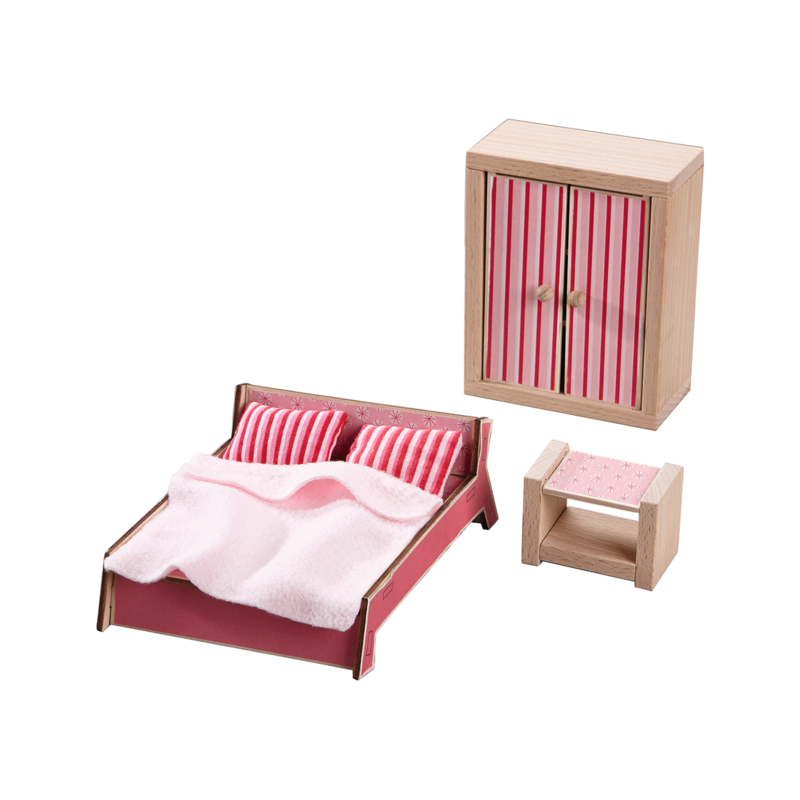 Einrichten und Umräumen macht Spaß! Mit den Puppenhausmöbeln Schlafzimmer Little Friends von Haba können die Kinder den entsprechenden Raum im Puppenhaus einrichten. Kinder lieben es, die kleinen Möbel, wie ein Bett, einen Schrank und einen Nachttisch in ihr Puppenhaus zu stellen und dann zu spielen.
