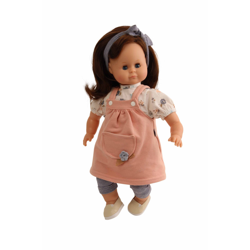 Die Arme, die Beine und der Kopf der Spielpuppe sind aus Vinyl. Der weiche Stoffkörper lädt zum Schmusen und Kuscheln ein. Die hübsche Puppe trägt Schuhe, ein kurzärmliges Oberteil mit Blümchen, ein Kleid mit Trägern , die mit Druckknöpfen versehen sind, eine gestreifte Leggings und ein passendes Stirnband.