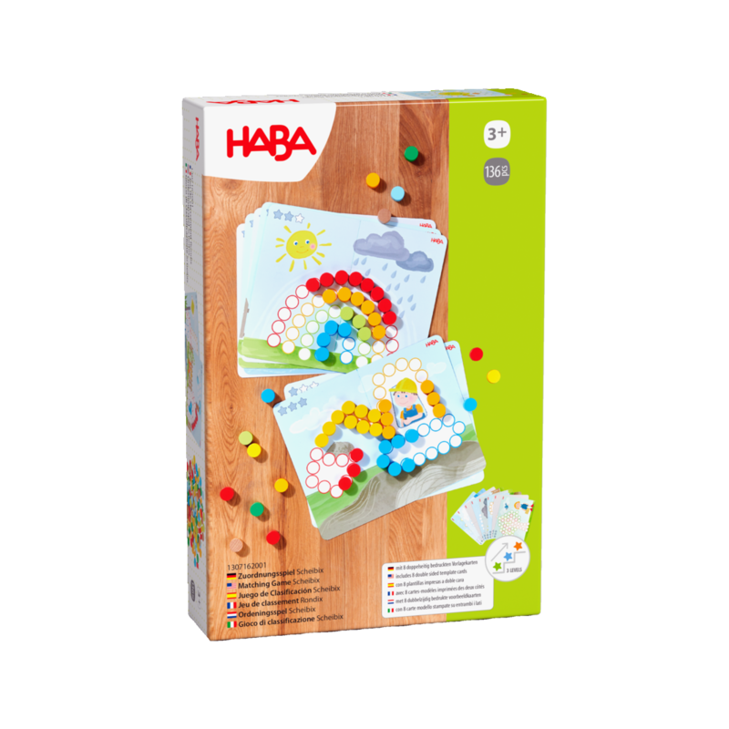 Das Zuordnungsspiel Scheibix ist ein kreatives Legespiel für Kinder ab 3 Jahre. Bei dem Spiel werden die illustrierten Motivvorlagen in verschiedenen Schwierigkeitsstufen mit bunten Holzscheibchen vervollständigt. Das Kind muss genau hinschauen und passend zuordnen. Spielerisch lernt es das Zuordnen von Farben.