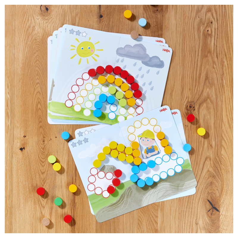 Inhalt: 128 bunte Holzscheiben, 8 doppelseitig bedruckte Vorlagekarten in drei Schwierigkeitsstufen