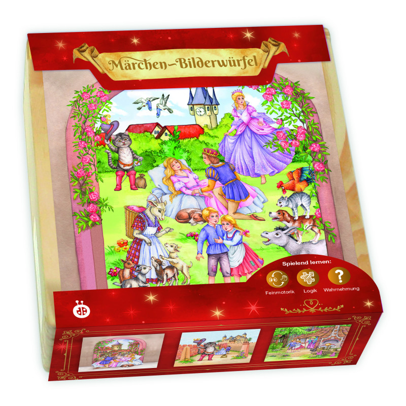 Aus den Würfelpuzzle lassen sich sechs Motive der bekannten Märchen: Die Bremer Stadtmusikanten, Aschenputtel, Der Wolf und die sieben Geißlein, Hänsel und Gretel, Der gestiefelte Kater und Dornröschen puzzeln.
